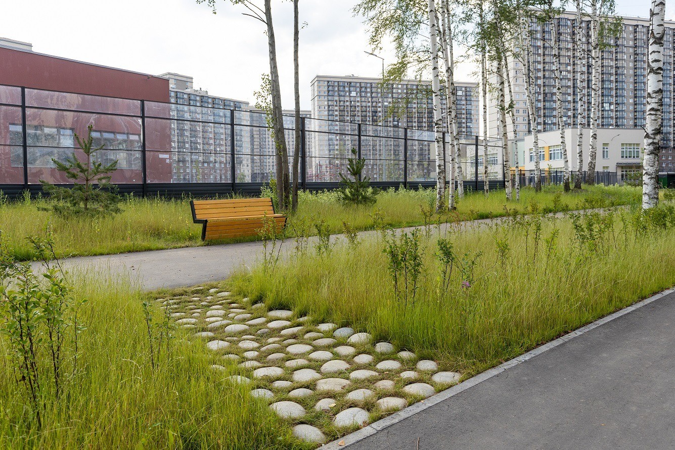 Дополнили пространство сеть пешеходных и велодорожек, а также аутентичные арт-объекты, созвучные концепции дружелюбной среды экорайона, на главной площади появились места отдыха и зеленые холмы.