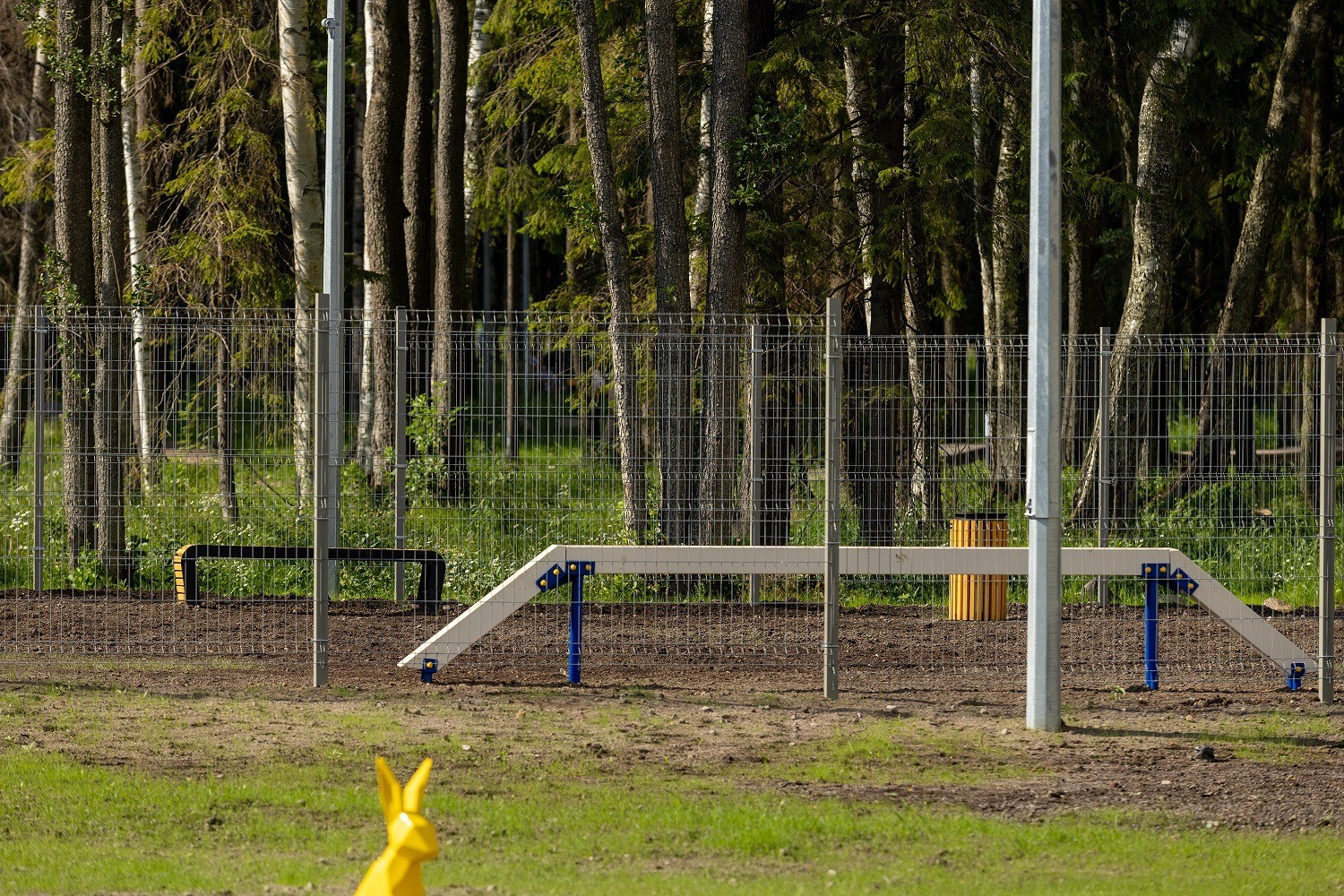 В северной части пространства располагается новая площадка для собак, которая стала второй по счету в жилом комплексе. На специально огороженной территории с урнами и скамейками владельцы четвероногих друзей смогут выгуливать своих питомцев и тренировать их.