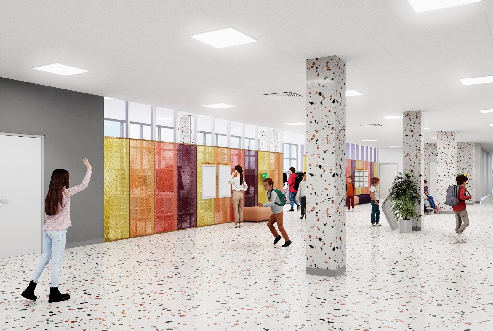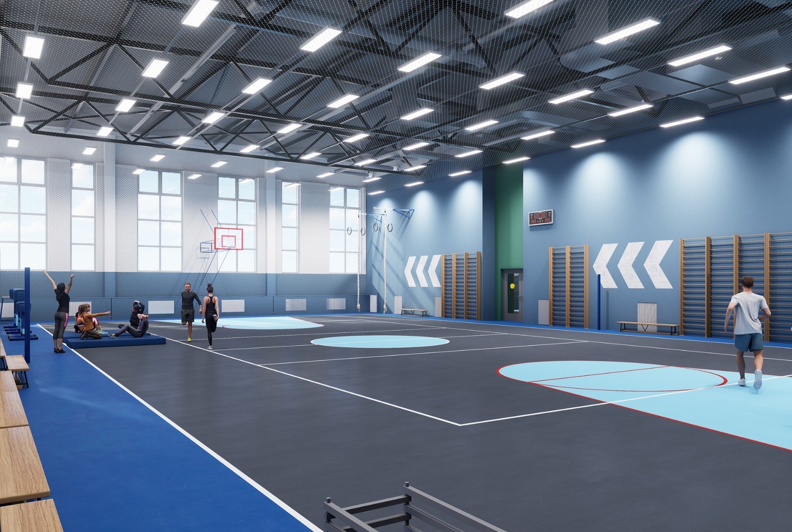 В разновысотном здании площадью около 18 тыс. кв. м предусмотрено 22 учебных класса, специализированные кабинеты для практических и лабораторных занятий, библиотека, актовый зал, а также спортивный кластер для уроков физкультуры, состоящий из двух бассейнов, залов для физкультуры и хореографии. Первый звонок для детей здесь прозвучит в 2025 году.