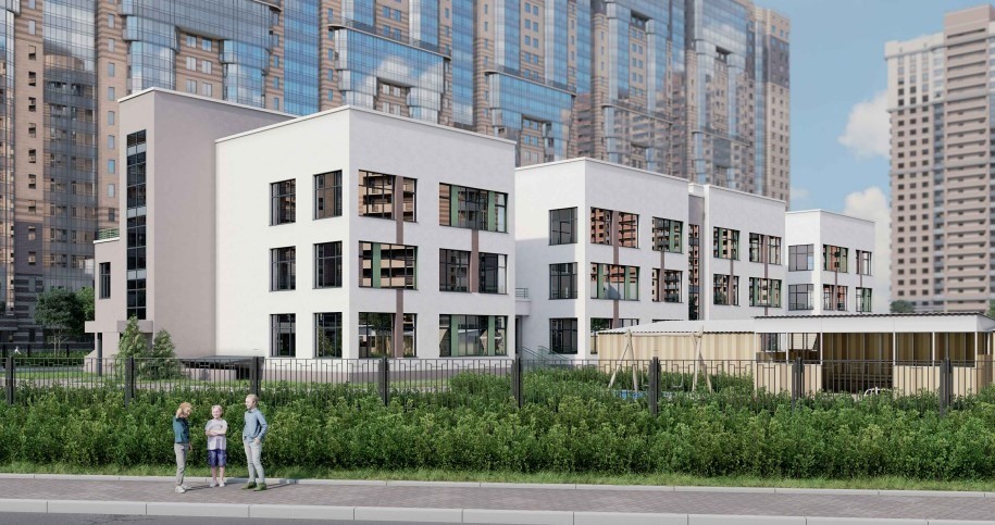 На прилегающей территории будут высажены деревья и кустарники, проложены пешеходные дорожки. Для каждой из групп предусмотрена площадка для игр и отдыха с теневыми навесами, организованы две спортивные площадки с гимнастическими оборудованием для занятий физкультурой на свежем воздухе, а также зона для хранения санок, колясок, велосипедов, защищенная навесом от осадков.